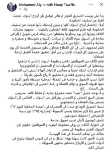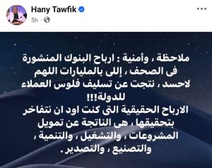 ورد محمد علي الرئيس التنفيذي والعضو المنتدب لمصرف أبو ظبي الإسلامي-مصر على صفحته على فيسبوك على الخبير الاقتصادي هاني توفيق بالقول: