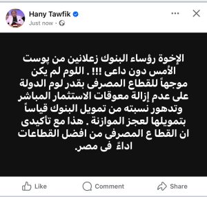 وقال توفيق على صفحته على موقع التواصل الاجتماعي ‘فيسبوك اللوم لم يكن للقطاع المصرفي بقدر لوم عدم القدرة على إزالة معوقات الاستثمار المباشر وتدهور نسبته من تمويلات البنوك نسبة إلى قيام البنوك بتمويل عجز الموازنه