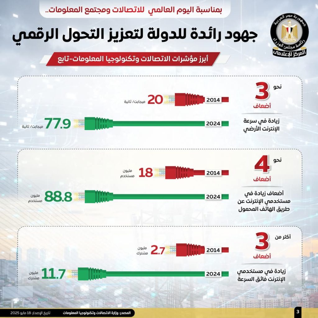 نشر «المركز الإعلامي لمجلس الوزراء»، مجموعة من الإنفوجرافات عبر منصاته على مواقع التواصل الاجتماعي، بمناسبة اليوم العالمي للاتصالات ومجتمع المعلومات، سلطت الضوء على الجهود الرائدة التي تبذلها الدولة لتعزيز التحول الرقمي، باعتباره محورًا رئيسًا لتحقيق التنمية المستدامة، وتبرز هذه الجهود ما تحقق في مجالات تطوير البنية التحتية التكنولوجية، وميكنة الخدمات الحكومية، وتحديث منظومة العمل الإداري، بما أسهم في تحسين جودة الخدمات المقدمة للمواطنين، ودعم الشفافية، ورفع كفاءة الأداء المؤسسي، إلى جانب تعزيز تنافسية الاقتصاد الوطني.