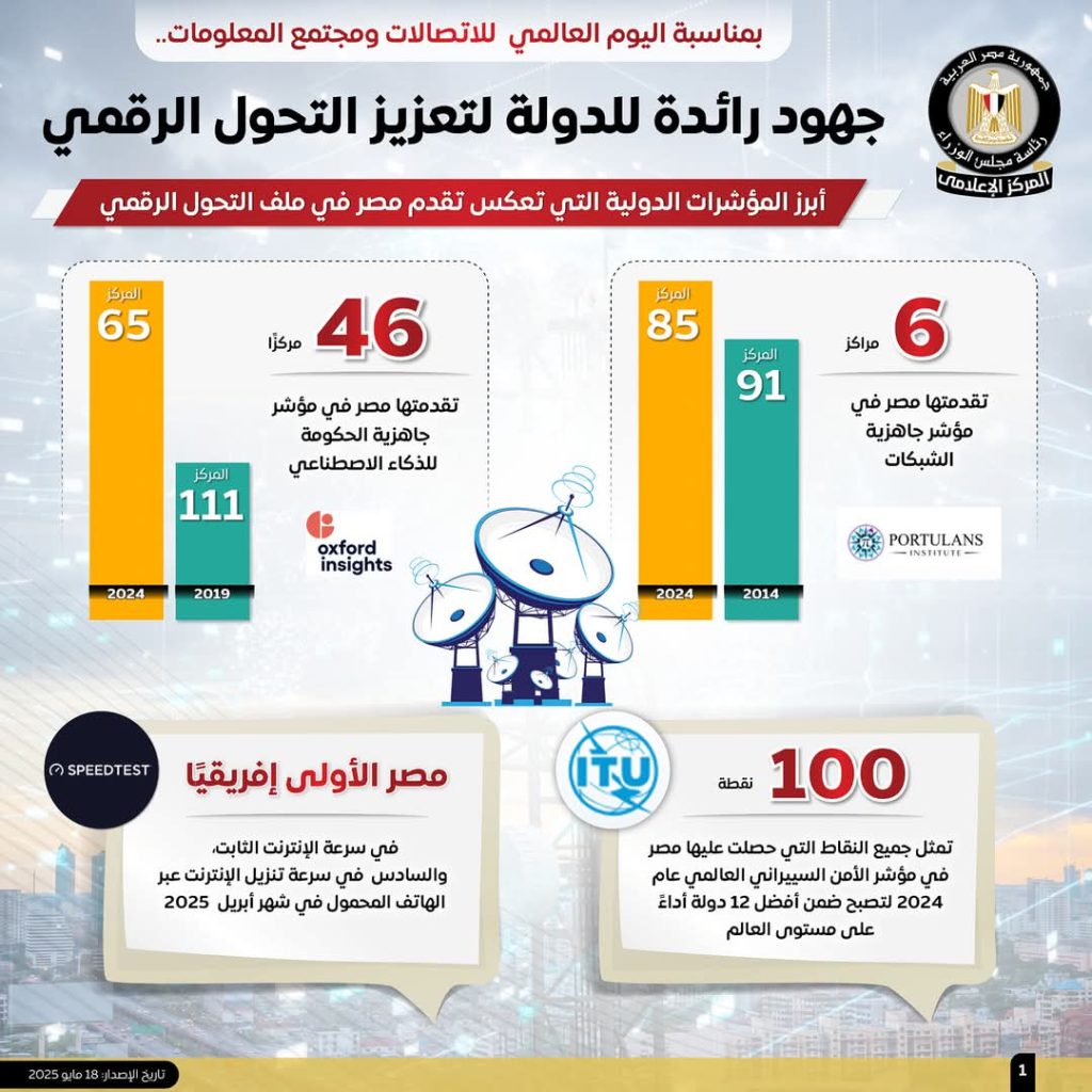 وفي مؤشر الأمن السيبراني العالمي، حصلت «مصر» على 100 نقطة عام 2024، لتصبح ضمن أفضل 12 دولة أداءً على مستوى العالم، كما احتلت المركز الأول إفريقيًا في سرعة الإنترنت الثابت، والـ 6 في سرعة تحميل الإنترنت عبر الهاتف المحمول في إبريل 2025.