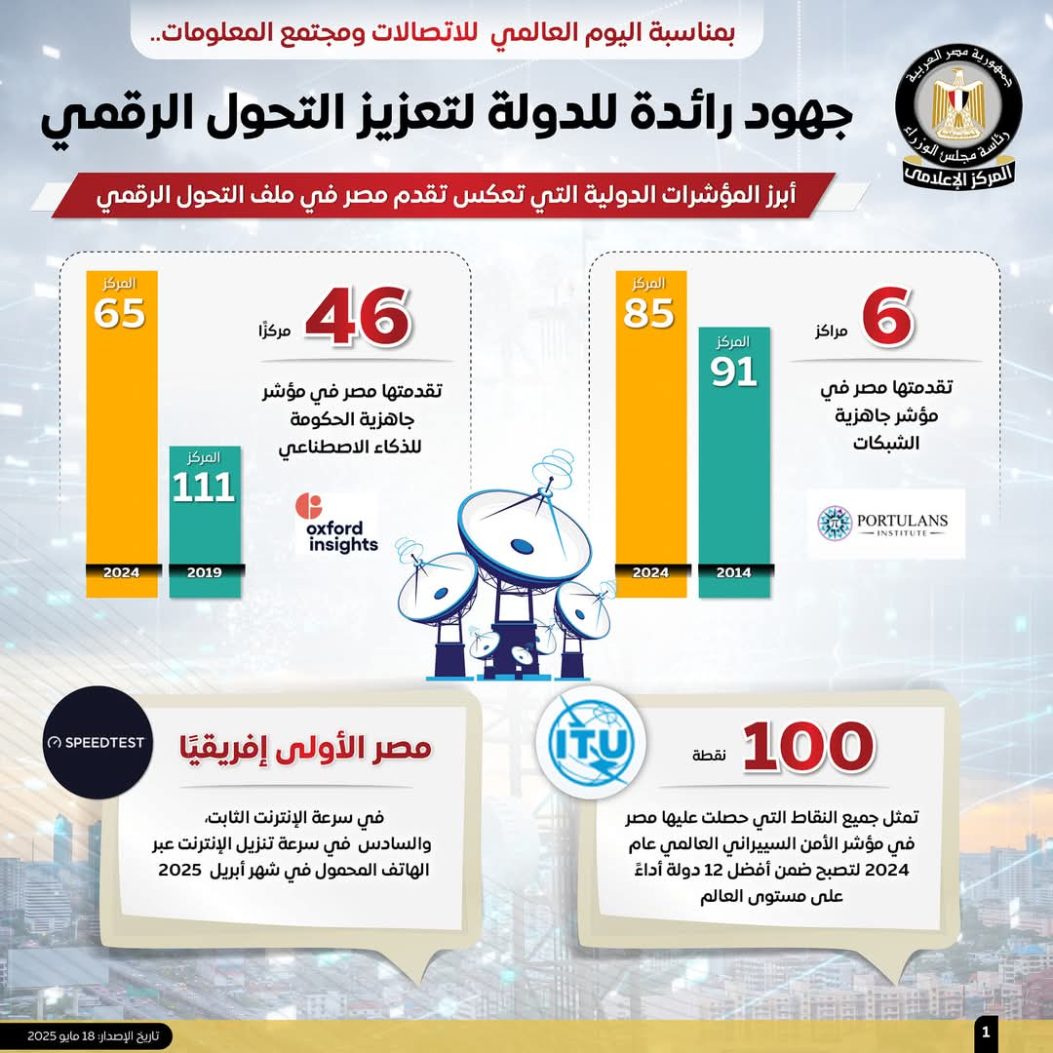 وفي مؤشر الأمن السيبراني العالمي، حصلت «مصر» على 100 نقطة عام 2024، لتصبح ضمن أفضل 12 دولة أداءً على مستوى العالم، كما احتلت المركز الأول إفريقيًا في سرعة الإنترنت الثابت، والـ 6 في سرعة تحميل الإنترنت عبر الهاتف المحمول في إبريل 2025.