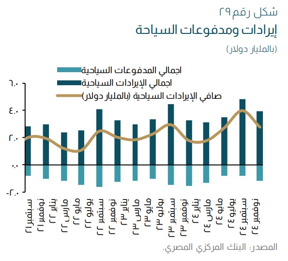 كشف البنك المركزي المصري، عن ارتفاع صافي إيرادات السياحة بنسبة 54% على أساس سنوي، مما يعكس استمرارية قدرة القطاع على الصمود وزيادة تنافسيته في ضوء الصراعات الإقليمية، والذي حد جزئياً من التراجع في إيرادات قناة السويس.