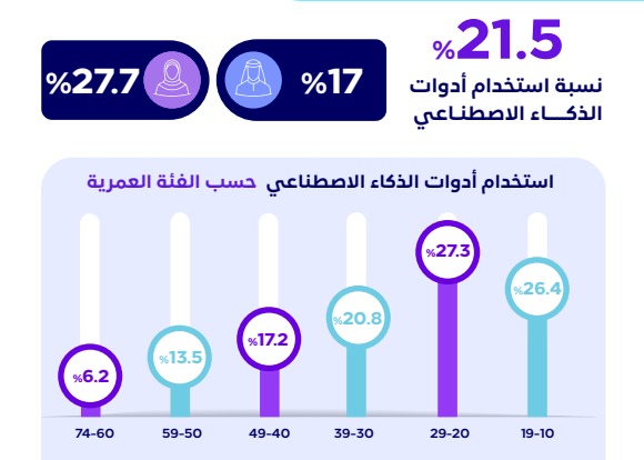 وعلى صعيد الفئات العمرية، أظهرت البيانات أن الفئة من 20 إلى 29 عامًا هي الأكثر استخدامًا لأدوات الذكاء الاصطناعي بنسبة 27.3%، تليها الفئة من 10 إلى 19 عامًا بنسبة 26.4%، ثم الفئة من 30 إلى 39 عامًا بنسبة 20.8%، ثم الفئة من في حين جاءت الفئة من 40 إلى 49 عامًا بنسبة 17.2%، وسجلت الفئة من 60 إلى 74عامًا أقل نسبة استخدام بـ 6.2%.