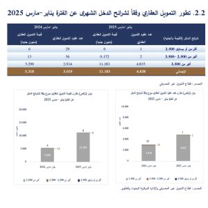 وفيما يتعلق بأرصدة التمويل العقاري وفقا لشرائح الدخل الشهري،أظهر التقرير استحواذ العملاء ذو الدخل الشهري الأكبر من 3500 جنيها شهريا على حصة سوقية قدرها 99.9%، من اجمالي عدد المستفيدين بمبلغ 11.183 مليار جنيه بعدد عقود 4838 عقد مقارنة بنحو 5.299 مليار جنيه وعدد عقود بلغ 2934 عقد في نفس الفترة من 2024