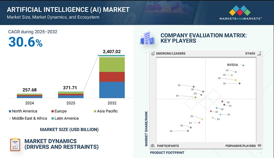 كشفت شركة الأبحاث العالمية «MarketsandMarkets» عن تقرير حديث يُشير إلى أن سوق الذكاء الاصطناعي العالمي سيشهد نموًا غير مسبوق، ليصل إلى نحو 2,407.02 مليار دولار أمريكي بحلول عام 2032، مقارنةً بـ 371.71 مليار دولار في عام 2025، بمعدل نمو سنوي مركب يبلغ 30.6% خلال فترة التوقعات.