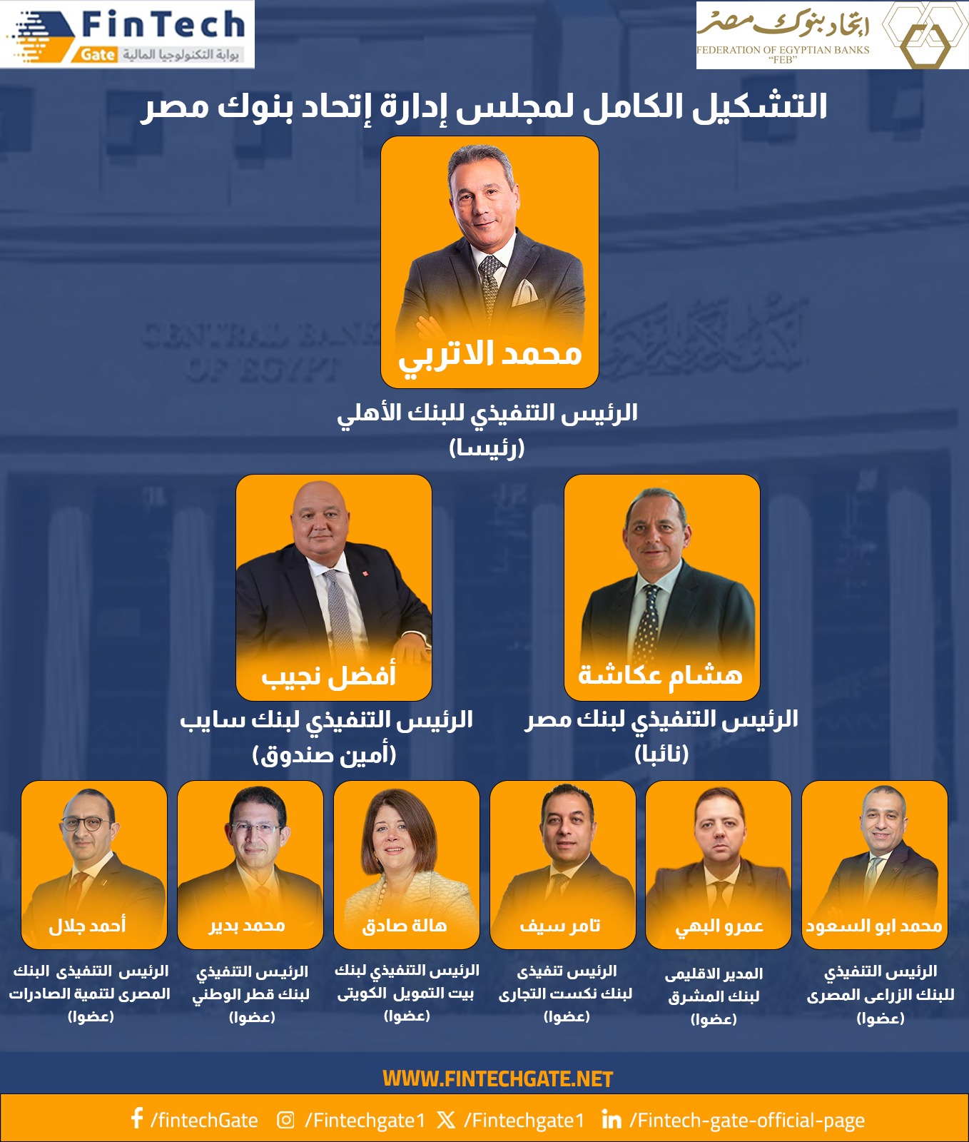 كما ضمت عضوية المجلس كل من محمد أبو السعودي الرئيس التنفيذي للبنك الزراعي المصري ومحمد بدير الرئيس التنفيذي لبنك قطر الوطني وهالة صادق الرئيس التنفيذذي لبنك بيت التمويل الكويتي وتامر سيف الدين الرئيس التنفيذي والعضو المنتدب لبنك نكست التجاري وأحمد جلال رئيس مجلس الإدارة التنفيذي للبنك المصري لتنمية الصادرات وعمر البهي المدير الاقليمي لبنك المشرق.