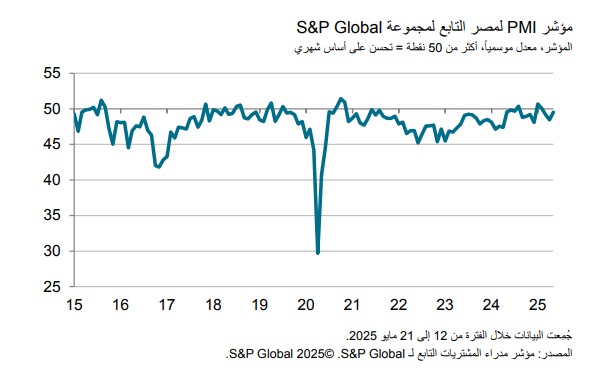 ارتفع مؤشر مديري المشتريات الرئيسي المصري من 48.5 نقطة في شهر أبريل إلى 49.5 نقطة في شهر مايو، لكنه ظل أقل من المستوى المحايد (50.0 نقطة)، ومع ذلك، كان المؤشر أعلى من متوسطه على المدى الطويل البالغ 48.2 نقطة.