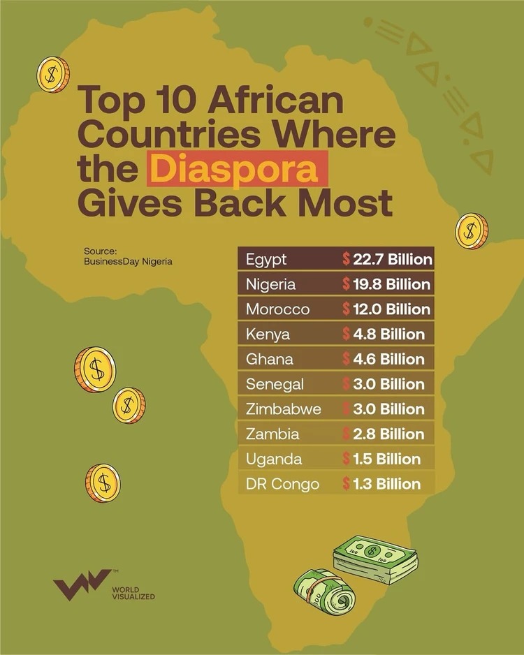 جاءت نيجيريا في المرتبة الثانية بنحو 19.8 مليار دولار، تلتها المغرب بـ 12 مليار دولار. وأكملت كينيا وغانا قائمة الدول الخمس الأولى، بتحويلات بلغت 4.8 مليار دولار و 4.6 مليار دولار على التوالي، مسجلتين معدلات نمو سنوية قوية.