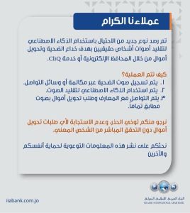 حذّر «البنك العربي الإسلامي الدولي» في بيان توعوي لعملائه من رصد نوع جديد من أساليب الاحتيال الإلكتروني، يعتمد على استخدام تقنيات الذكاء الاصطناعي لتقليد أصوات أشخاص حقيقيين لخداع الضحية وإقناعها بتحويل أموال من خلال المحافظ الإلكترونية أو عبر خدمة «CliQ».