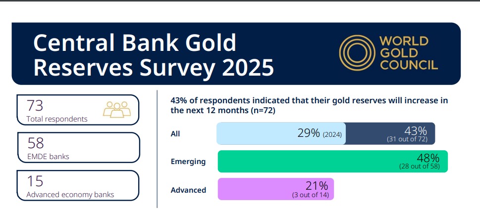 وأوضح تقرير استطلاع حيازات الذهب لدى البنوك المركزية لعام 2025، والذي أُجري خلال الفترة من 25 فبراير إلى 20 مايو، أن 95% من البنوك المركزية المشاركة تتوقع استمرار نمو الاحتياطيات العالمية من الذهب خلال العام المقبل، في حين أفاد 43% منها بأنها تخطط لزيادة احتياطياتها الخاصة من المعدن الأصفر خلال نفس الفترة، وهي أعلى نسبة تُسجل منذ انطلاق هذا الاستطلاع قبل 8 سنوات.