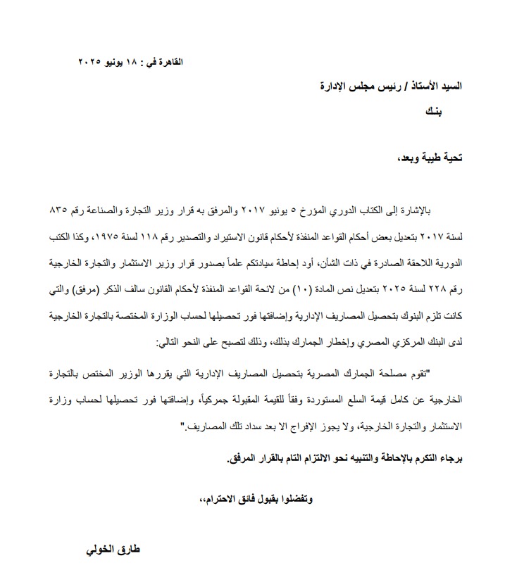 أصدر البنك المركزي المصري كتابًا دوريًا بشأن القرار الوزاري المتعلق بتحصيل المصاريف الإدارية المطبقة على العمليات الاستيرادية، وجه فيه البنوك العاملة بالسوق المحلية بضرورة الالتزام بتطبيق قرار وزير الاستثمار والتجارة الخارجية رقم 228 لسنة 2025، بشأن تعديل قواعد تحصيل المصاريف الإدارية على العمليات الاستيرادية.