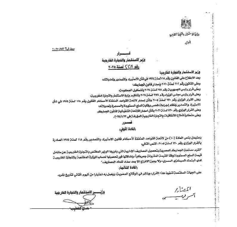 وأوضح المركزي في خطابه إلى رؤساء مجالس إدارات البنوك، أن القرار الوزاري الجديد عدل نص المادة (10) من لائحة القواعد المنفذة لأحكام قانون الاستيراد والتصدير رقم 118 لسنة 1975. وبموجب التعديل، تتولى مصلحة الجمارك المصرية تحصيل المصاريف الإدارية المقررة على كامل قيمة السلع المستوردة وفقًا للقيمة المقبولة جمركيًا، على أن تُضاف فور تحصيلها لحساب وزارة الاستثمار والتجارة الخارجية، ولا يُسمح بالإفراج الجمركي عن الواردات إلا بعد سداد تلك المصاريف.