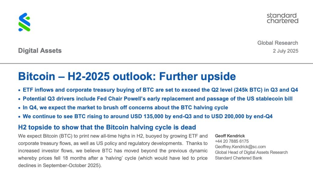 توقّع بنك «Standard Chartered» العالمي أن تسجّل العملة المشفرة «بيتكوين» مستوى قياسيًا جديدًا يبلغ 135 ألف دولار خلال الربع الثالث من عام 2025، مدفوعة بزيادة ملحوظة في تدفقات صناديق الاستثمار المتداولة «ETF» وعمليات الشراء المؤسسية عبر الخزائن.