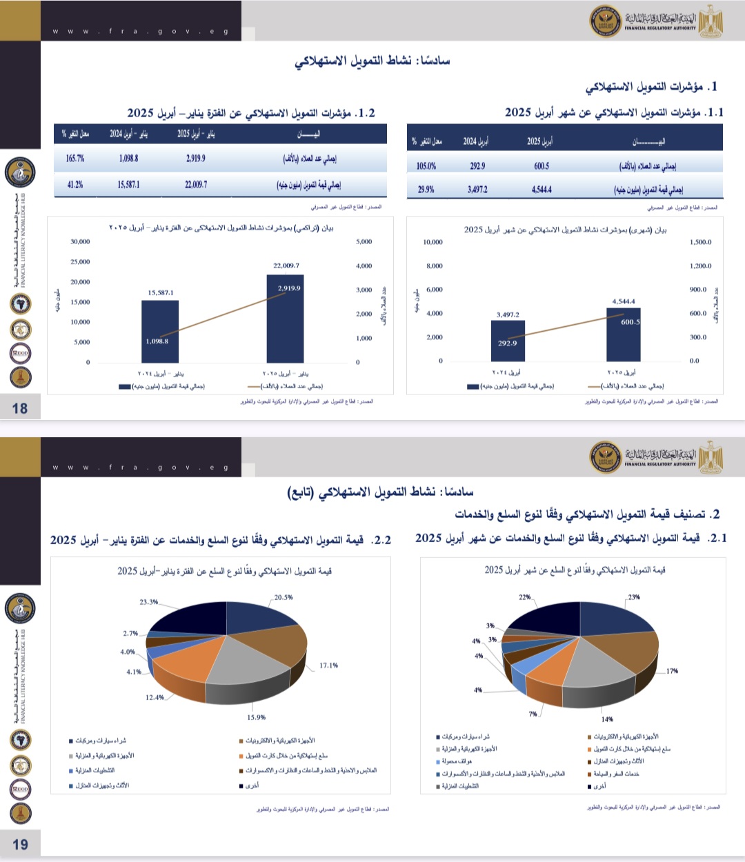 ارتفعت قيمة التمويلات الممنوحة من شركات التمويل الاستهلاكي خلال الفترة(يناير-ابريل) من العام الحالي لتبلغ 22.009 مليار جنيه مقابل 15.587 مليار جنيه خلال نفس الفترة من 2024 بارتفاع بلغت نسبته 41.2%.