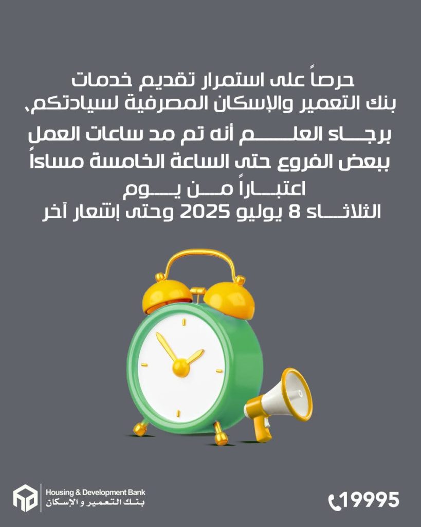 أعلن بنك التعمير والإسكان عن مدّ ساعات العمل بعدد من فروعه على مستوى الجمهورية حتى الساعة الخامسة مساءً، وذلك بدءًا من يوم الثلاثاء الموافق 8 يوليو 2025، وحتى إشعار آخر، في إطار حرص البنك على استمرار تقديم خدماته المصرفية لعملائه بكل كفاءة وتيسير إنجاز معاملاتهم.