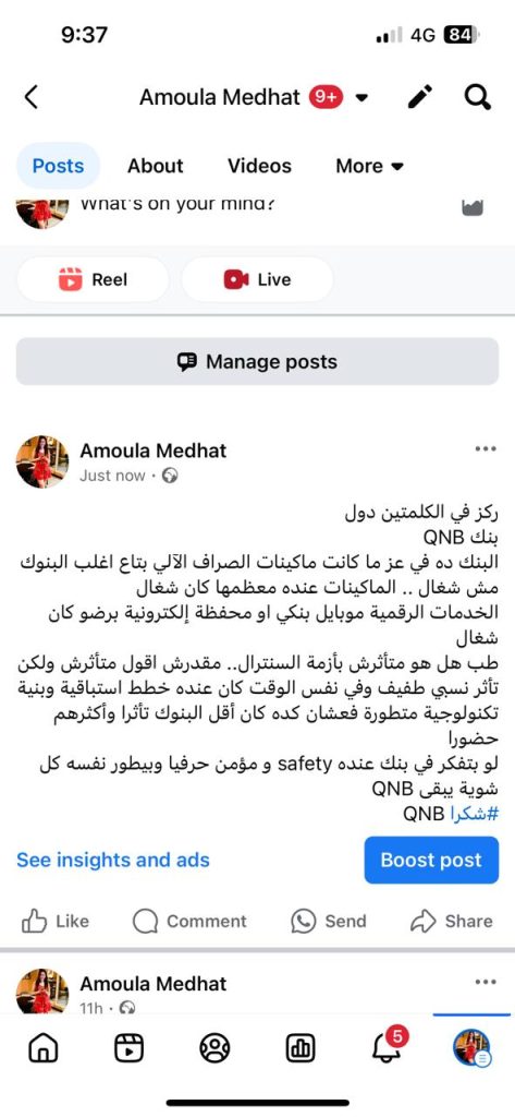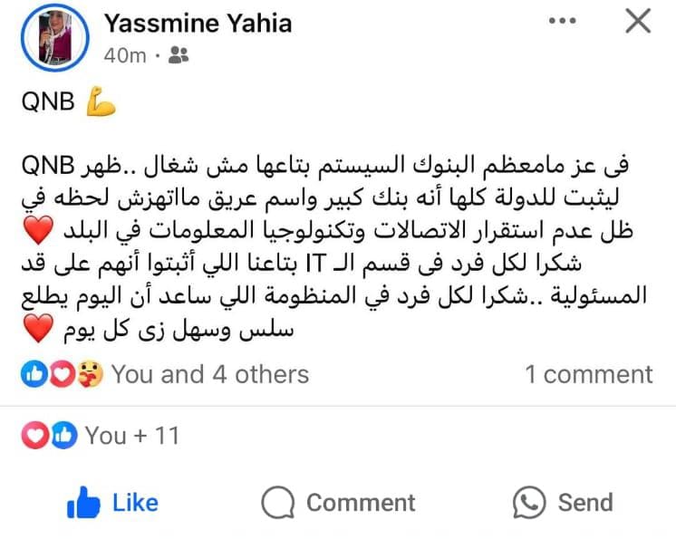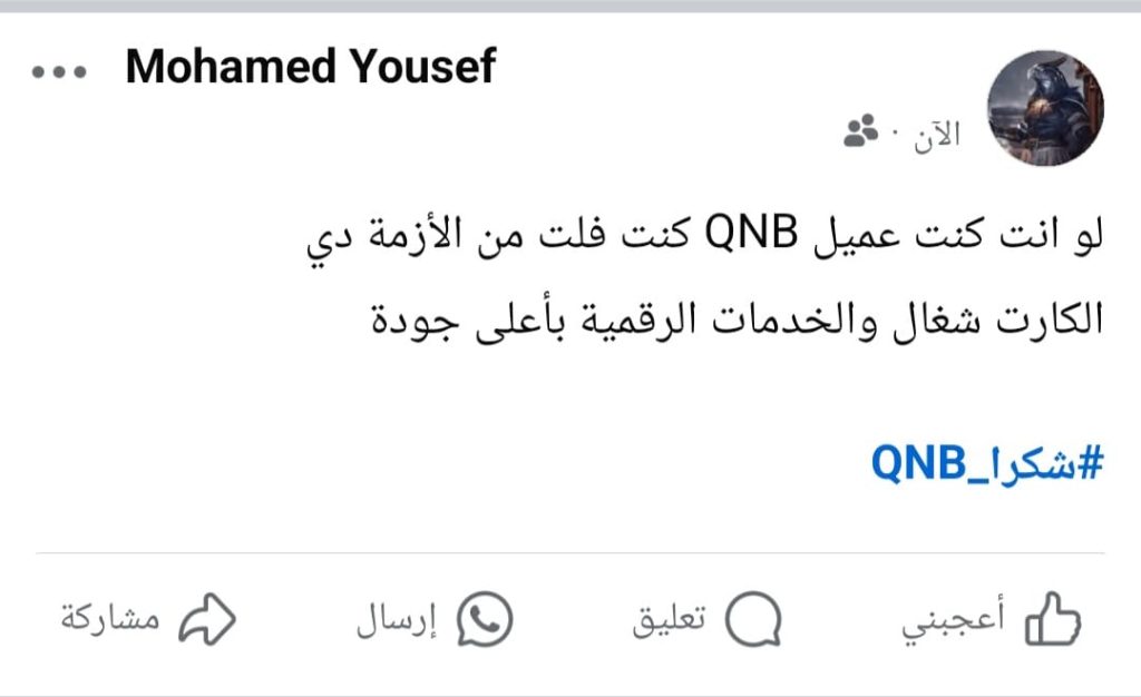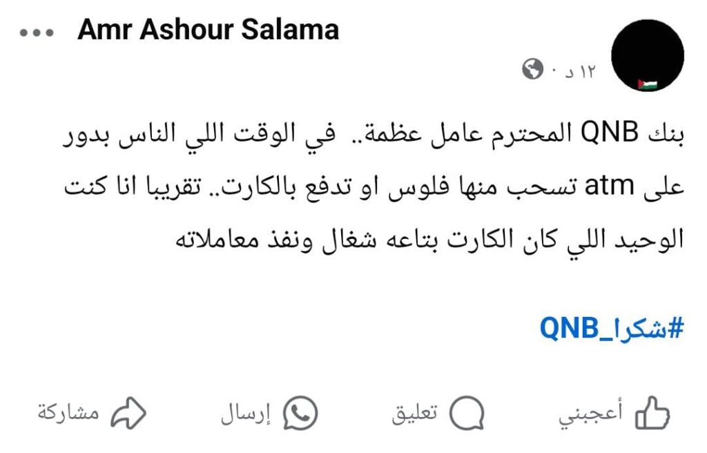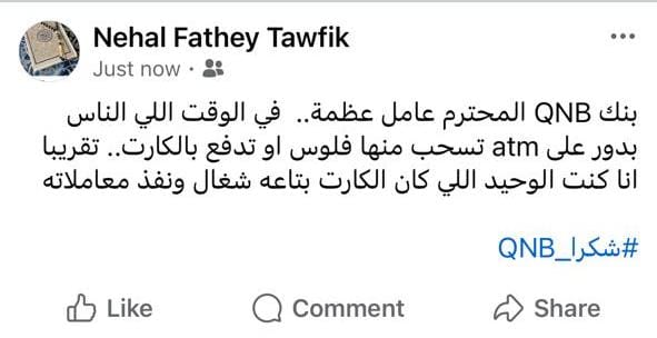 وجاء في تعليق لأحد العملاء: “لو كنت عميل QNB مصر في أزمة سنترال رمسيس.. كنت فلت. الكارت شغال والخدمات الرقمية بأعلى جودة”.