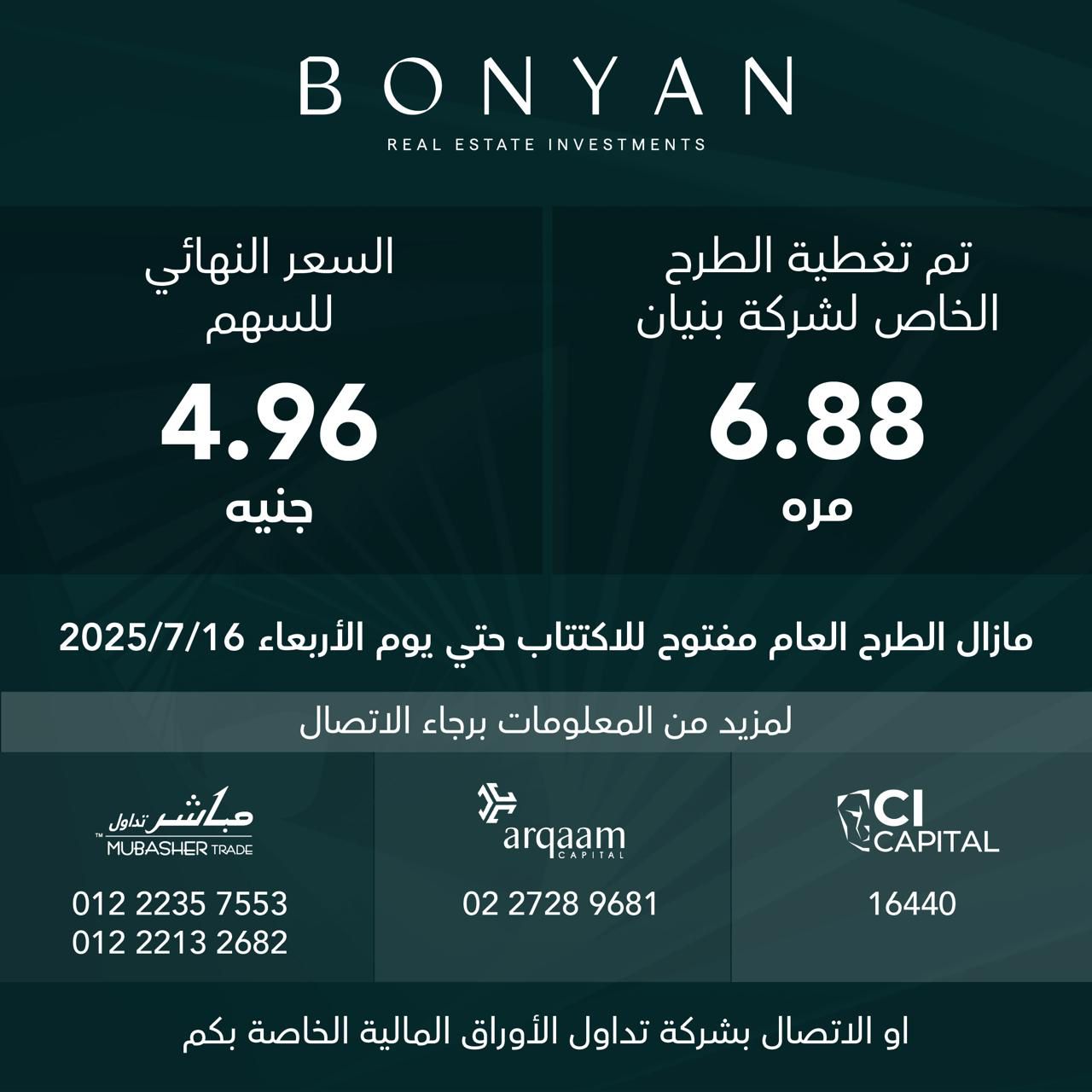 أعلنت شركة بنيان للتنمية والتجارة (ش.م.م) عن تحديد السعر النهائي للطرح بمبلغ (4.96) جنيه مصري للسهم الواحد.