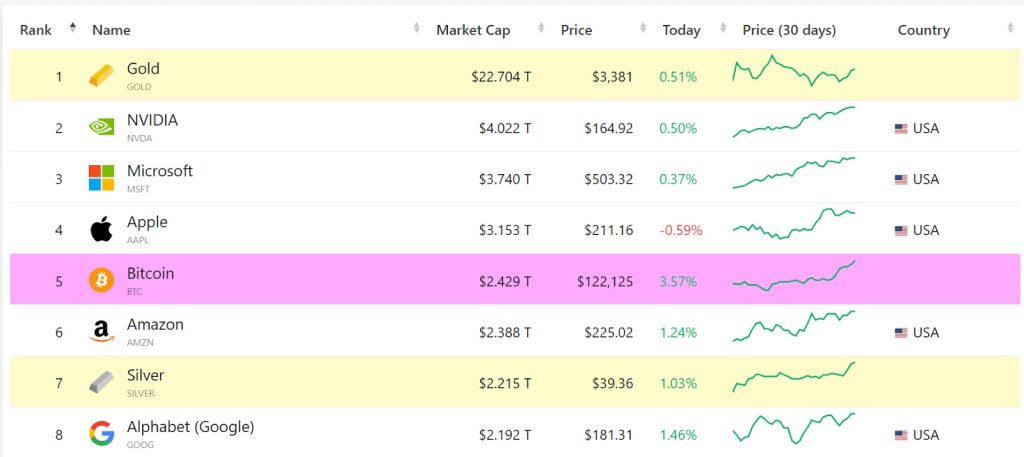 وسجّلت «Bitcoin» ارتفاعًا بنسبة تقارب 13% خلال أسبوع واحد، لتبلغ قيمتها السوقية نحو 2.4 تريليون دولار، متخطية بذلك «Amazon» التي تبلغ قيمتها 2.3 تريليون دولار، إلى جانب الفضة وشركة «Alphabet» المالكة لـ«Google».