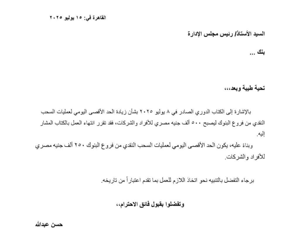 قرر البنك المركزي المصري إيقاف العمل بالقرار المؤقت الصادر في 8 يوليو 2025، والذي كان قد نص على رفع الحد الأقصى اليومي لعمليات السحب النقدي من فروع البنوك إلى 500 ألف جنيه مصري لكل من الأفراد والشركات.