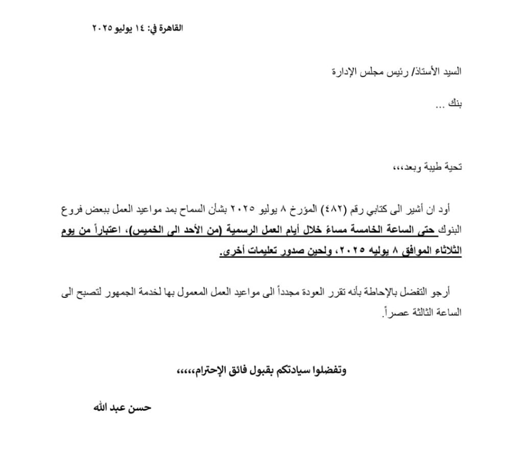 أعلن البنك المركزي المصري عن إلغاء التوجيه رقم (٤٨٢) الصادر بتاريخ 8 يوليو 2025، والذي كان قد نص على مدّ ساعات العمل في بعض فروع البنوك حتى الساعة الخامسة مساءً.