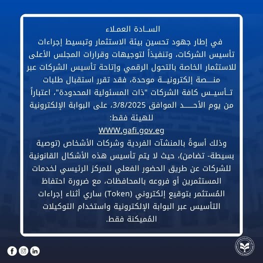 وتأتي هذه الخطوة تنفيذًا لتوجيهات المجلس الأعلى للاستثمار الرامية إلى تبسيط إجراءات تأسيس الشركات وتحسين مناخ الاستثمار في مصر، عبر إتاحة خدمات التأسيس لكافة الأشكال القانونية إلكترونيًا، وذلك أسوةً بما تم تطبيقه على المنشآت الفردية وشركات الأشخاص (توصية بسيطة – تضامن).