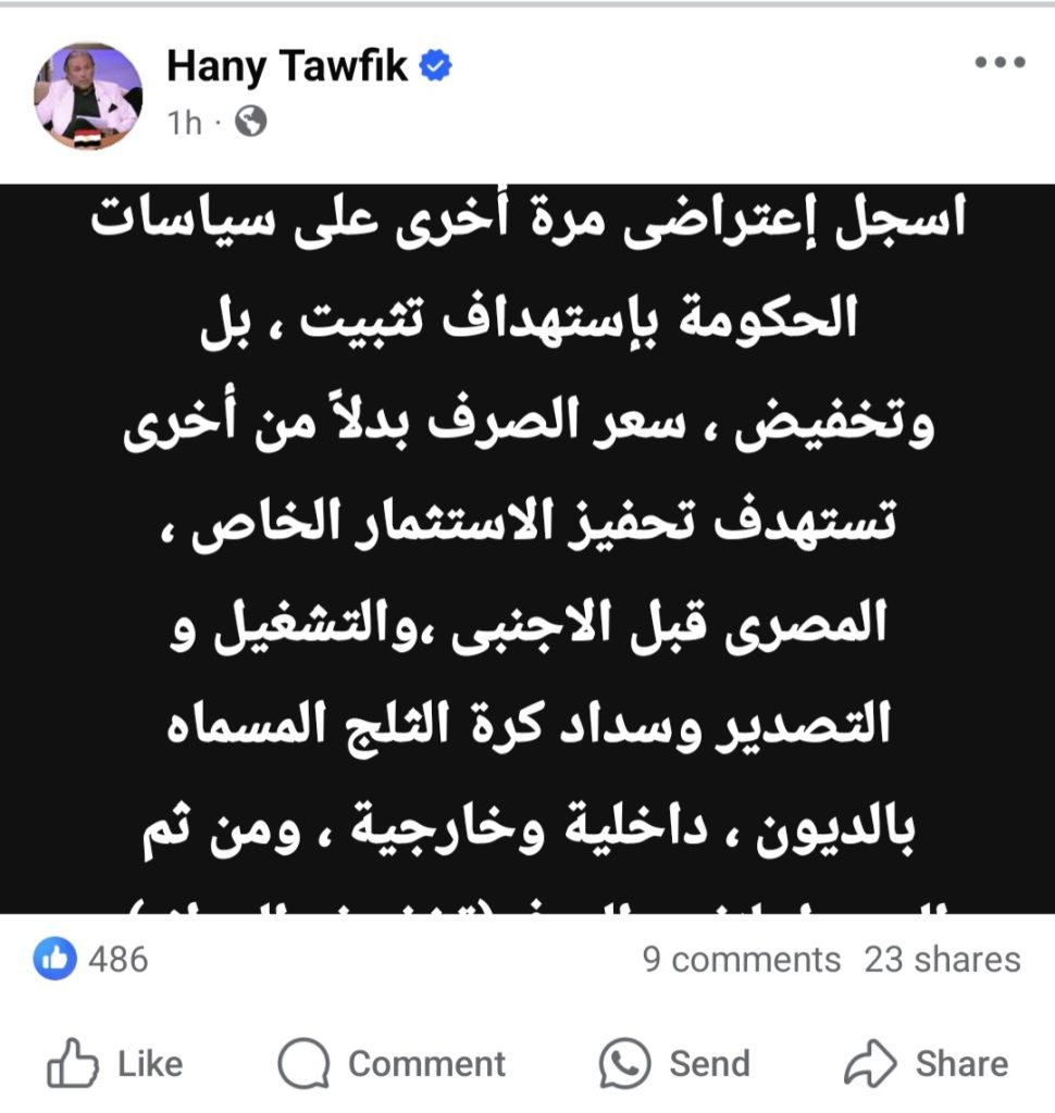 وقال توفيق على صفحته على موقع التواصل الاجتماعي فيسبوك: “أسجل اعتراضي مرة أخرى على سياسات الحكومة التي تستهدف تثبيت، بل وتخفيض، سعر الصرف، بدلاً من تبني سياسات أكثر فاعلية تُحفّز الاستثمار الخاص – المصري قبل الأجنبي – وتشجع التشغيل والتصدير، إلى جانب العمل على سداد كرة الثلج المسماة بالديون، سواء كانت داخلية أو خارجية للوصول لنفس الهدف وهو خفض الدولار.