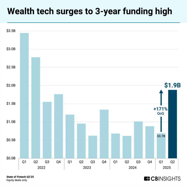 وشهد قطاع إدارة الثروات الرقمية (Wealth Tech) انتعاشًا ملحوظًا، حيث قفزت التمويلات بنسبة 171% على أساس ربعي لتصل إلى 1.9 مليار دولار، في أقوى أداء له منذ 3 سنوات، مدفوعًا بجولات بارزة مثل استثمار «Addepar» بقيمة 230 مليون دولار، وجولة «Groww» بـ200 مليون دولار.
