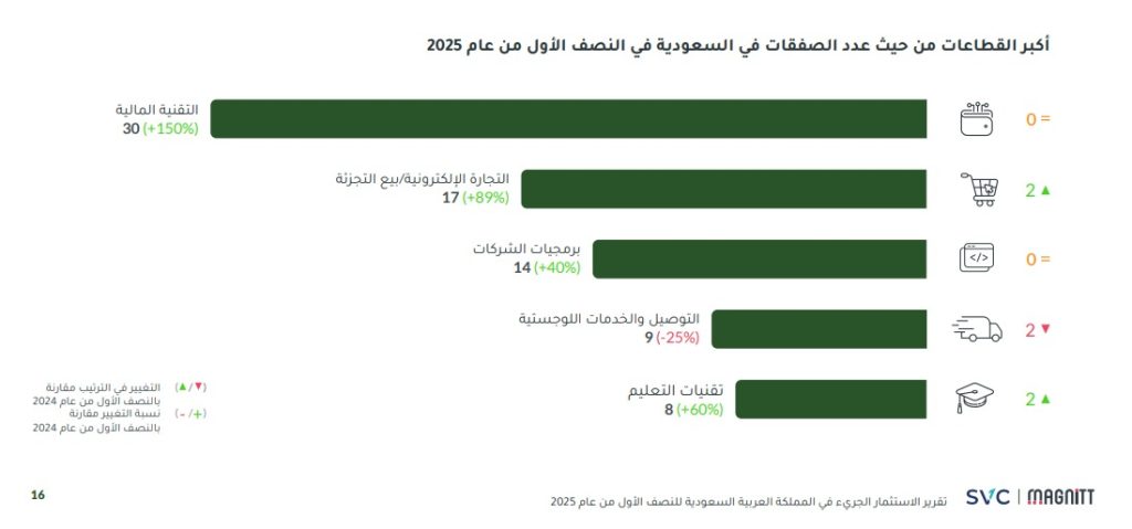 تصدر قطاع التقنية المالية منظومة الاستثمار الجريء في المملكة العربية السعودية من حيث عدد الصفقات، يليه قطاع التجارة الإلكترونية/التجزئة، برمجيات المؤسسات، التوصيل والخدمات اللوجستية، وتقنية التعليم، حيث شكلوا معًا %68 من إجمالي نشاط الصفقات في المملكة.