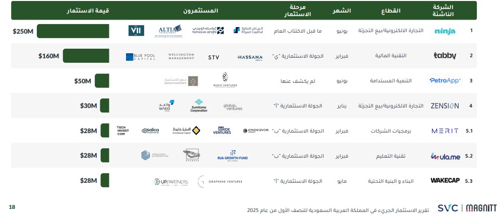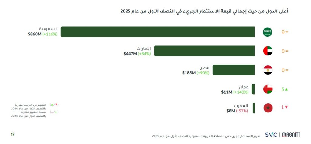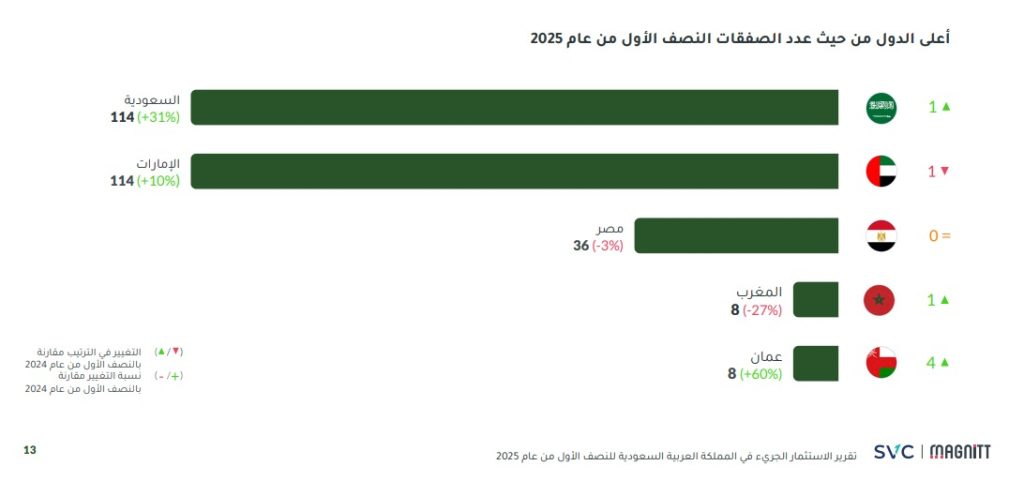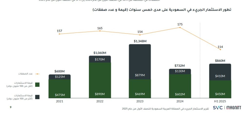 بفضل ارتفاع سنوي قدره %215 في قيمة الصفقات الضخمة و%67 في قيمة الصفقات غير الضخمة، احتلت المملكة العربية السعودية المرتبة الأولى من حيث قيمة الاستثمار الجريء وعدد الصفقات في النصف الأول من عام 2025.