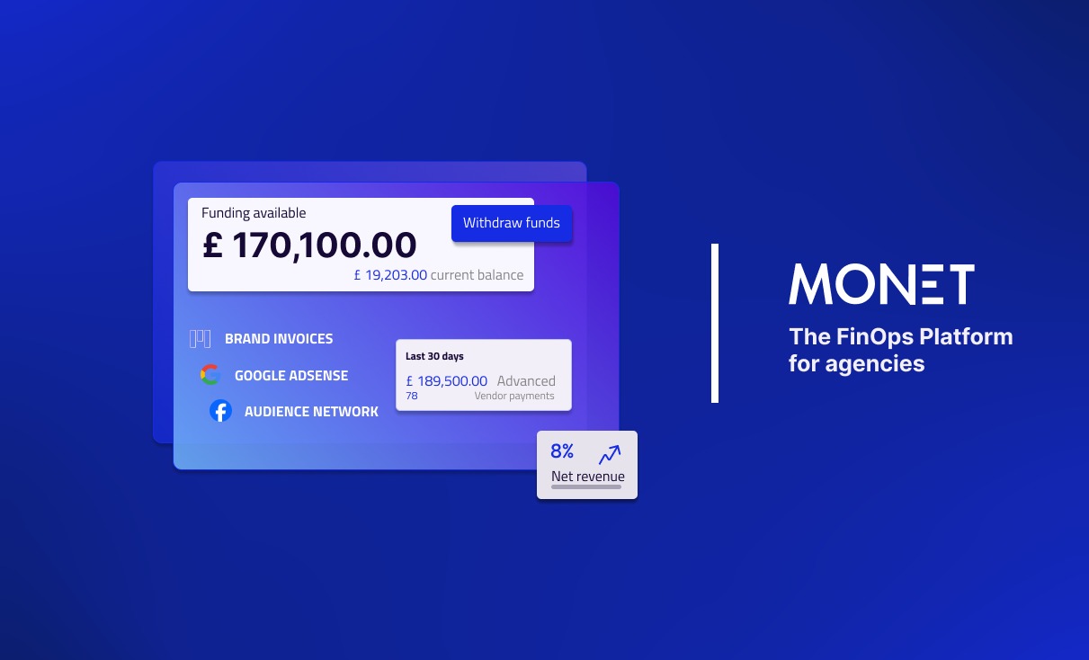وتقدم «Monet»، ومقرها لندن، منصة مالية متكاملة تمكّن الوكالات الإبداعية من إدارة التدفقات النقدية بمرونة خلال الحملات الكبرى على التلفزيون ومواقع التواصل والموسيقى والألعاب، ومن أبرز عملائها وكالة «Cowshed Collective» صاحبة إنتاج برنامج «Locked In» على يوتيوب لصالح «Footasylum».