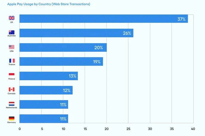 وفي المقابل، تُظهر المملكة المتحدة ميلاً واضحًا نحو «Apple Pay»، التي تمثل 37% من معاملات المتاجر الإلكترونية، لتتفوق بذلك على البطاقات الائتمانية التي تستحوذ على 27% فقط من العمليات، ما يجعل بريطانيا واحدة من الأسواق القليلة التي تتفوق فيها «Apple Pay» على بطاقات الائتمان.