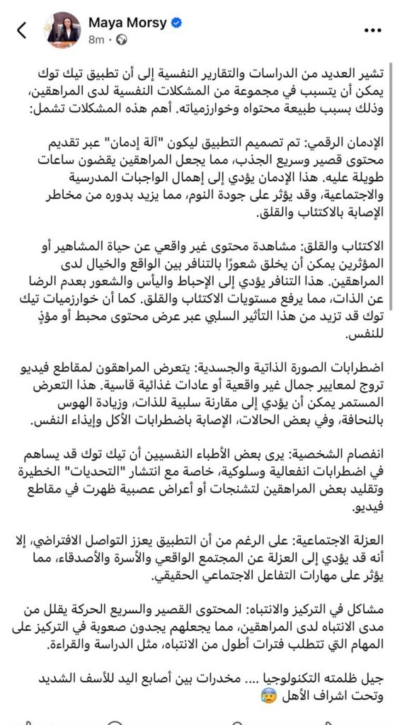 قالت الدكتورة مايا مرسي وزيرة التضامن الاجتماعي، إن العديد من الدراسات والتقارير النفسية تشير إلى أن تطبيق تيك توك يمكن أن يتسبب في مجموعة من المشكلات النفسية لدى المراهقين، وذلك بسبب طبيعة محتواه وخوارزمياته.
