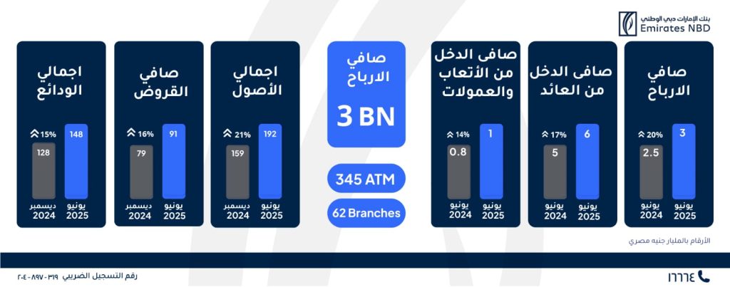 Emirates NBD – Egypt, one of the largest banks operating in the Egyptian banking sector, announced a significant growth in its financial results ending June 2025, the bank’s net profit increased by 20 % achieving EGP 3 bn, compared to EGP 2.5 bn2.5 bn during the counter period in 2024.