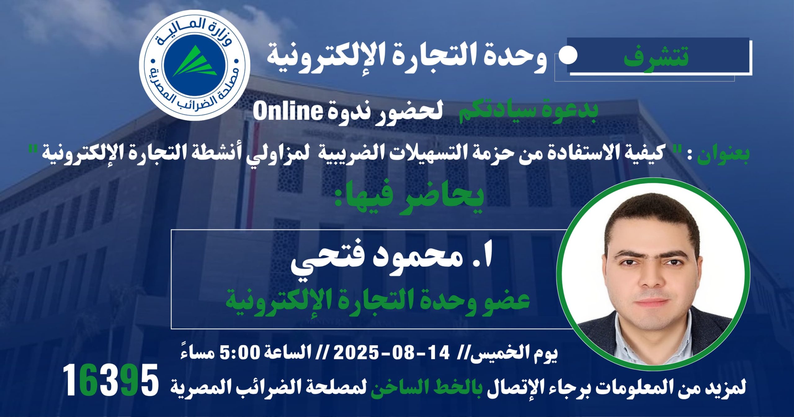 أعلنت وحدة التجارة الإلكترونية بمصلحة الضرائب المصرية عن تنظيم ندوة أونلاين متخصصة بعنوان “كيفية الاستفادة من حزمة التسهيلات الضريبية الجديدة لمزاولي أنشطة التجارة الإلكترونية”، وذلك يوم الخميس 14 أغسطس 2025 في تمام الساعة الخامسة مساءً عبر تطبيق Microsoft Teams.