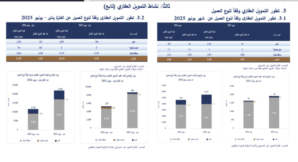 وأوضح التقرير استحواذ العملاء العاديين على 20.6 % من إجمالي النشاط، بمبلغ 4.959 مليار جنيه مقابل 2.547 مليار جنيه خلال نفس الفترة من 2024 ووصل عدد عقود التمويل العقاري للعملاء العاديين إلى 390 عقد، مقابل 229 عقد خلال نفس الفترة من 2024، ولم يحصل عملاء الصندوق على أي تمويل عقاري خلال أول 6 شهور من 2025 مقابل 362 عقد بقيمة 96 مليون جنيه خلال النصف الاول من 2024.