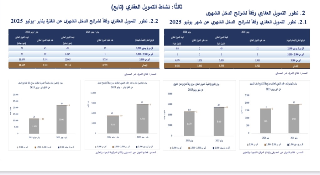 وفيما يتعلق بأرصدة التمويل العقاري وفقا لشرائح الدخل الشهري،أظهر التقرير استحواذ العملاء ذو الدخل الشهري الأكبر من 3500 جنيها شهريا على حصة سوقية قدرها 99.7 %، من اجمالي عدد المستفيدين بمبلغ.22.065 مليار جنيه بعدد عقود 8716 عقد مقارنة بنحو 11.653 مليار جنيه وعدد عقود بلغ 5191 عقد في نفس الفترة من 2024.