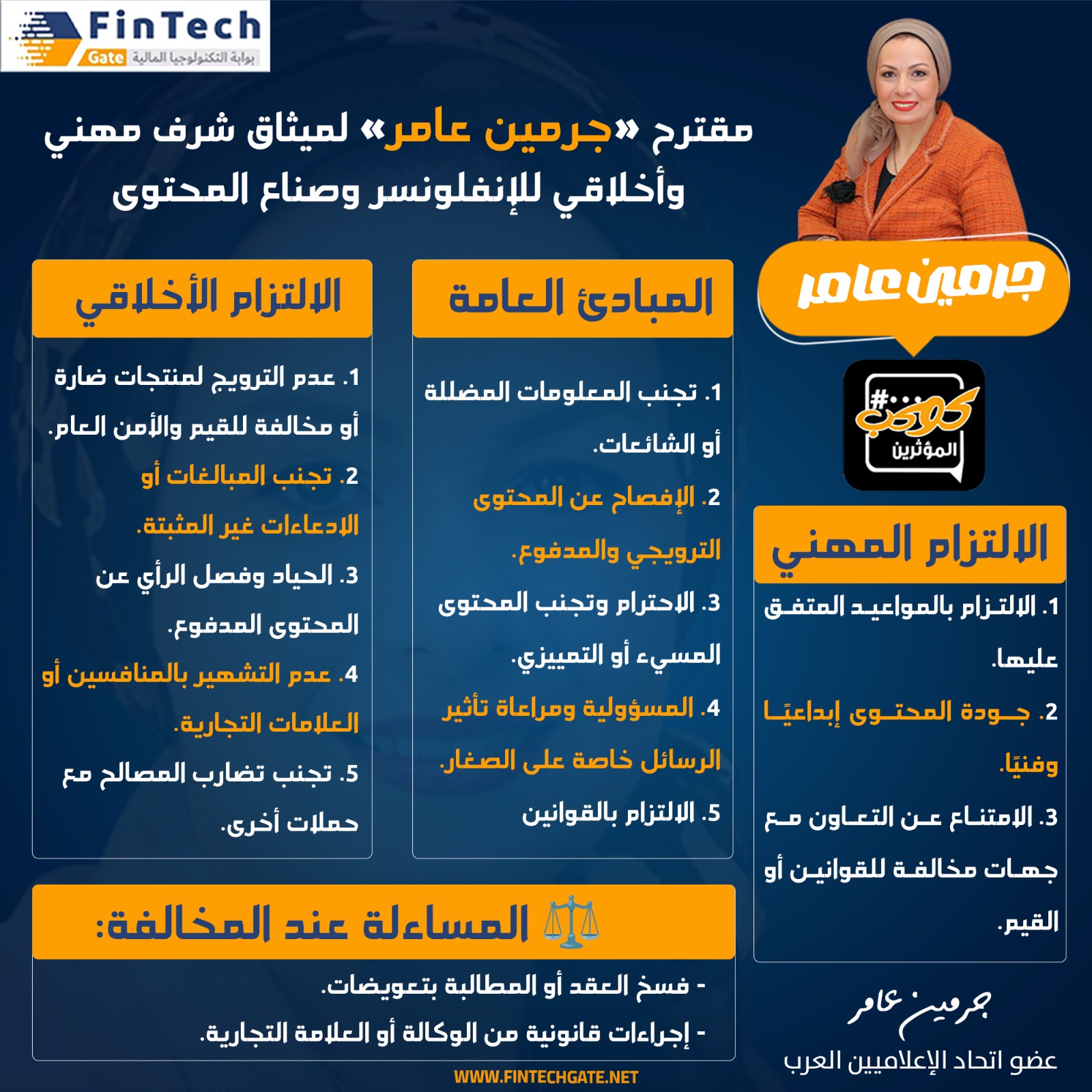 أطلقت الإعلامية چرمين عامر، عضو اتحاد الإعلاميين العرب، دعوة مفتوحة للإسراع في صياغة وإعلان ميثاق شرف مهني وأخلاقي للمؤثرين وصناع المحتوى في العالم العربي، يحدد مساحات واضحة لحرية التعبير، ويتضمن مبادئ عامة وآليات للمساءلة لضمان الموضوعية والشفافية وحماية ملايين المتابعين.
