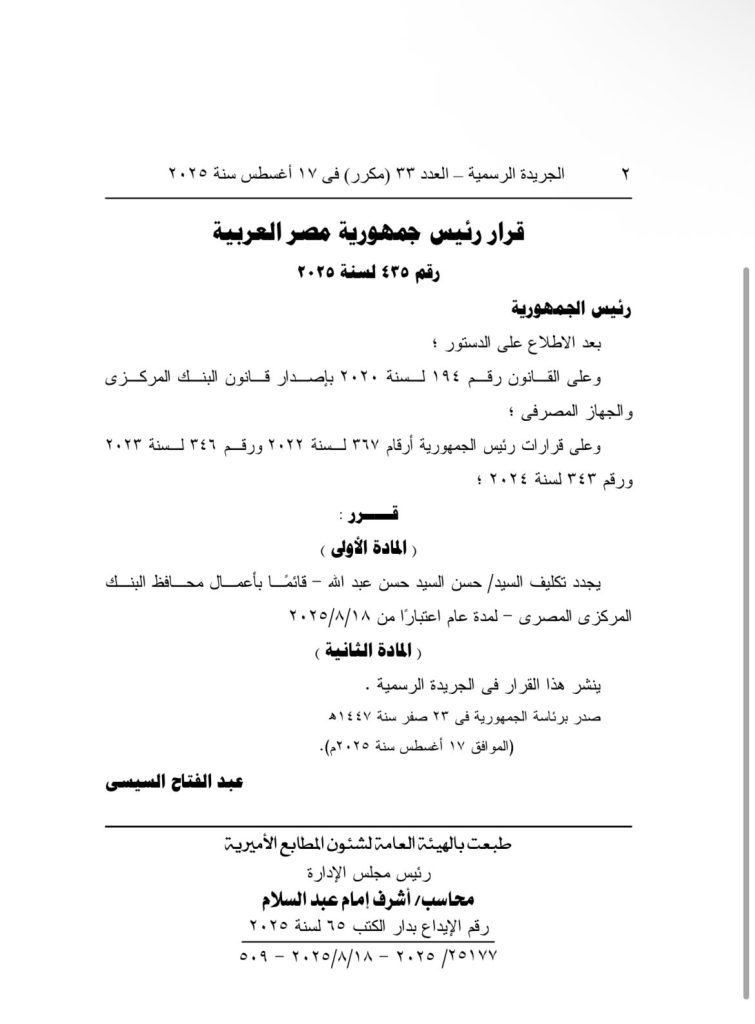 قرار جمهوري بتجديد تكليف حسن عبد الله قائم باعمال محافظ البنك المركزي المصري.