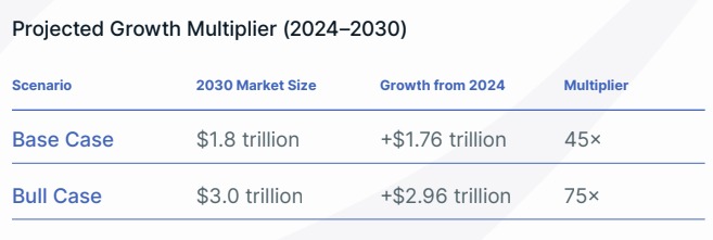 توقعت تقارير McKinsey – التي استشهد بها تقرير Bitfinex – أن تصل قيمة سوق الأوراق المالية المرمّزة إلى نحو 3 تريليونات دولار في السيناريو المتفائل، ونحو 1.8 تريليون دولار في السيناريو الأساسي بحلول عام 2030.