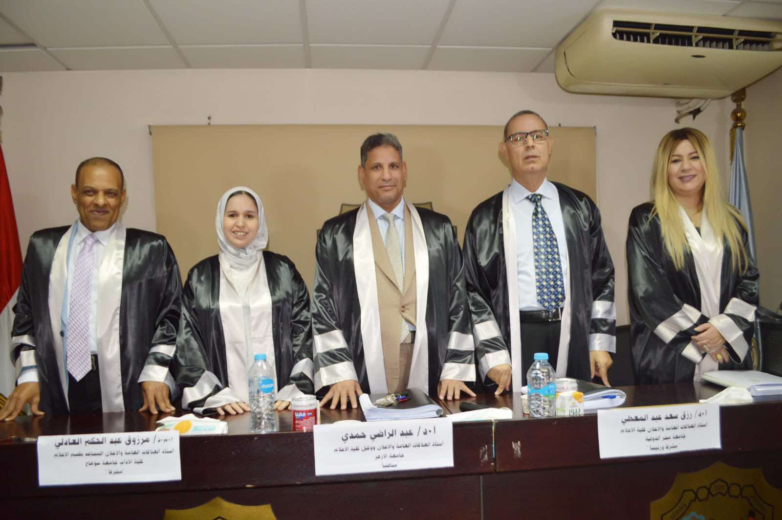 وتكونت لجنة التحكيم والمناقشة من الاستاذ الدكتور رزق سعد عبد المعطي، أستاذ العلاقات العامة بجامعة مصر الدولية، مشرفا ورئيسا، والأستاذة الدكتورة نيرمين زكريا خضر، رئيس الجامعة العربية المفتوحة بالقاهرة، وعميد كلية الإعلام، مشرفا، والأستاذ الدكتور عبد الراضي حمدي أستاذ العلاقات العامة والإعلان، ووكيل كلية الإعلام بجامعة الأزهر، مناقشا، والدكتور مرزوق العادلي، استاذ العلاقات العامة والإعلان المساعد بكلية الآداب بجامعة سوهاج، مشرفا مشارك.