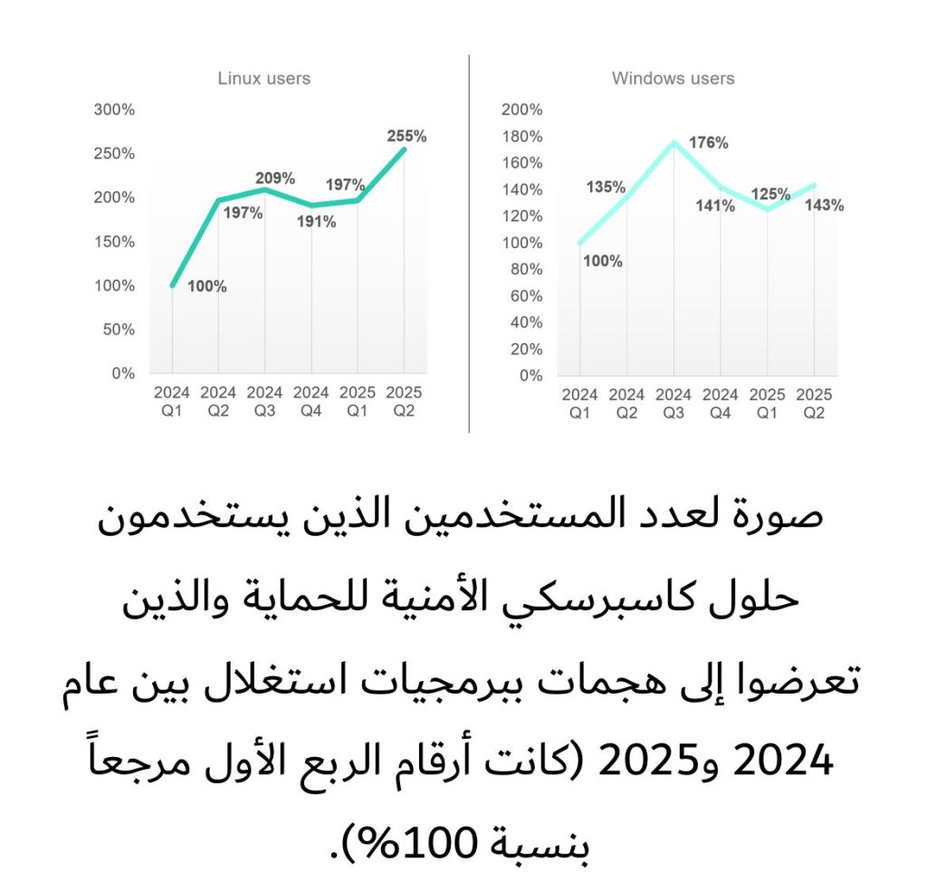 أظهرت بيانات جديدة من كاسبرسكي أن عدد مستخدمي نظامي ويندوز (Windows) ولينكس (Linux) الذين أصيبوا بهجمات برمجيات الاستغلال خلال النصف الأول لعام 2025 زاد مقارنة بعام 2024.
