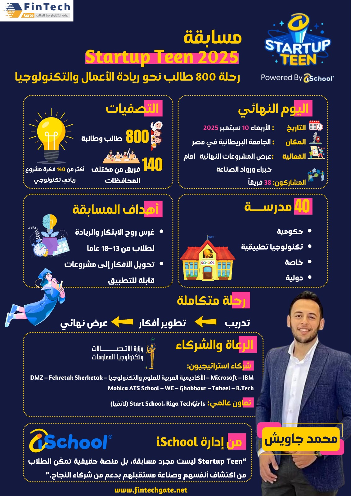 وسط دعم واسع من شركاء محليين ودوليين، تُتوَّج النسخة الأولى من مسابقة Startup Teen بالوصول إلى محطتها الأهم، مرحله التصفيات النهائية (The National Day)، المقرر انعقاده في حرم الجامعة البريطانية في مصر (BUE) يوم ١٠ سبتمبر ٢٠٢٥ ليكون احتفالية كبرى تضم جميع الشركاء والطلاب المشاركين، وعرض المشروعات النهائية أمام نخبة من الخبراء ورواد الصناعة.