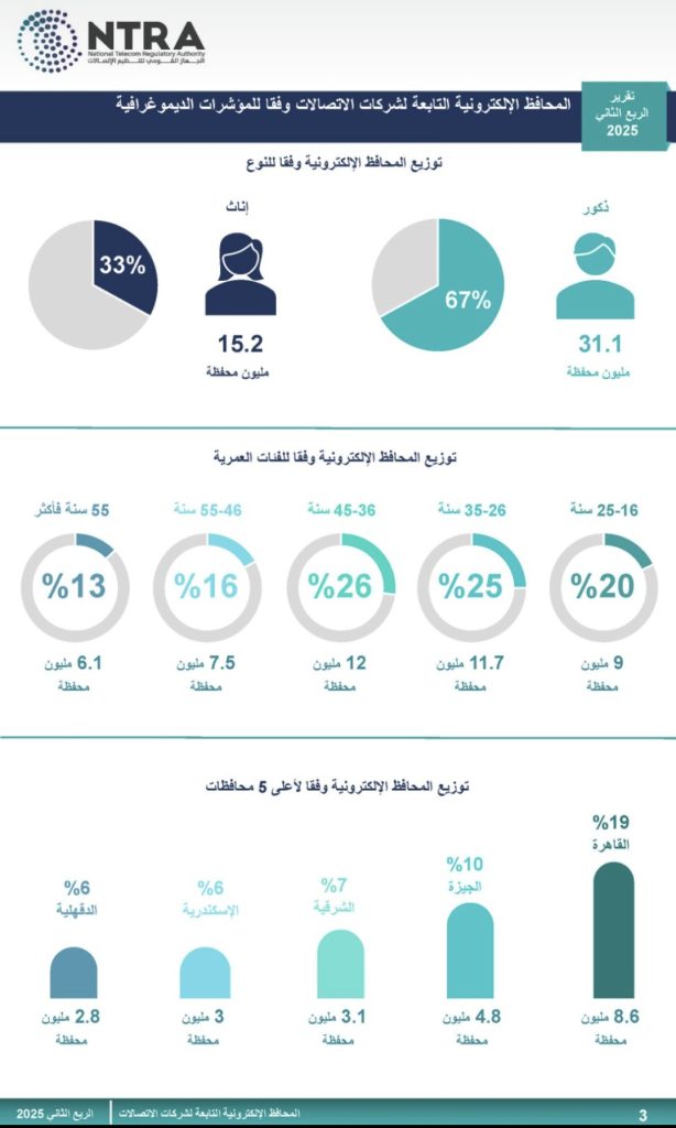الصفحة الرئيسية أخبار«القومي لتنظيم الاتصالات» : الذكور يستحوذون على 67% من المحافظ الإلكترونية.. و«محافظة القاهرة» تتصدر بـ8.6 مليون محفظة في الربع الثاني 2025