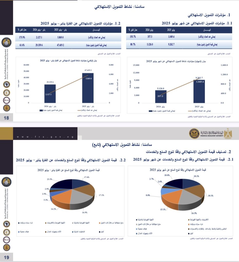 سجلت سوق التمويل الاستهلاكي في مصر قفزة كبيرة خلال السبعة أشهر الأولى من العام الحالي، إذ ارتفعت قيمة التمويلات الممنوحة من شركات التمويل الاستهلاكي إلى 47.4 مليار جنيه مقابل 29.339 مليار جنيه خلال نفس الفترة من 2024، محققة نموًا بنسبة 61.6%.