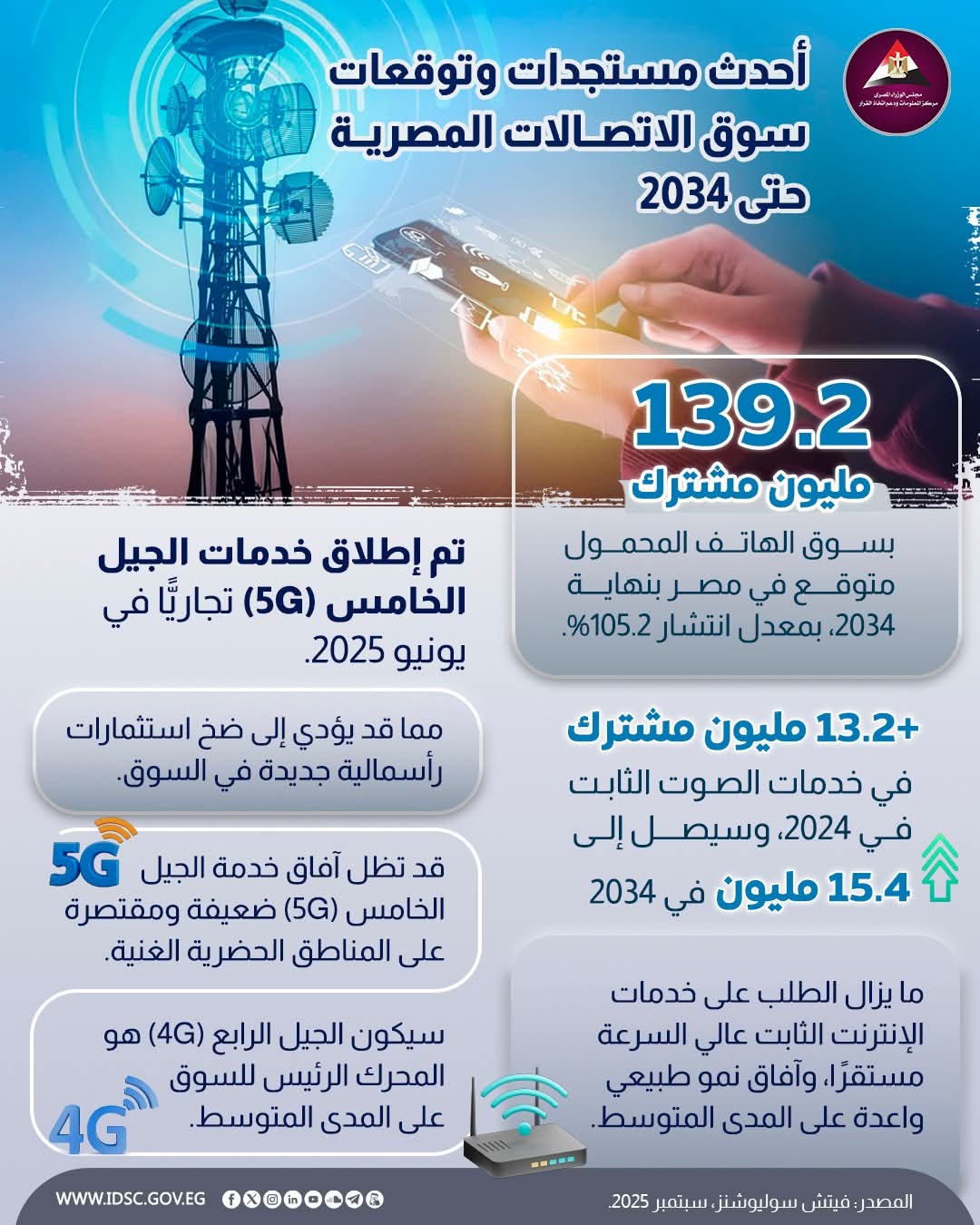 أكد الانفوجراف أنه تم إطلاق خدمات الجيل الخامس (5G) تجاريًا في مصر خلال يونيو 2025، وهو ما قد يسهم في ضخ استثمارات رأسمالية جديدة بالسوق.