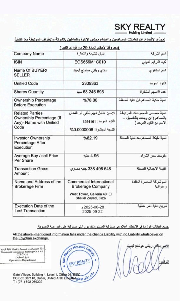 الصفحة الرئيسية عقارات تك«سكاي ريلتي هولدينج» ترفع حصتها في «بنيان»إلى 82.19% عبر صفقة شراء تتجاوز 338 مليون جنيه