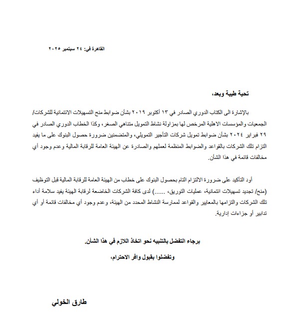أوضح «المركزي المصري» أن الخطاب الصادر عن «الرقابة المالية» يجب أن يثبت التزام الشركات بالمعايير المنظمة لنشاطها، وألا تكون هناك مخالفات قائمة أو جزاءات إدارية مفروضة عليها. ويأتي ذلك في إطار حماية القطاع المالي وتعزيز ممارسات التمويل السليمة.