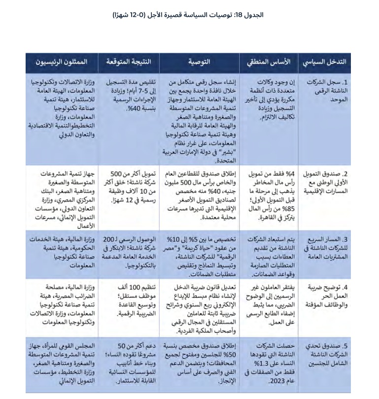 من بين أبرز التوصيات القصيرة المدى، جاء اقتراح إنشاء منصة تسجيل رقمية موحدة تسهل إجراءات التأسيس للشركات الناشئة، بدلًا من النظام الحالي المشتت بين جهات مختلفة مثل الهيئة العامة للاستثمار، جهاز تنمية المشروعات، الهيئة العامة للرقابة المالية، وهيئة تنمية صناعة تكنولوجيا المعلومات.