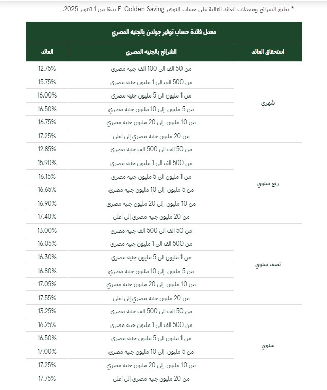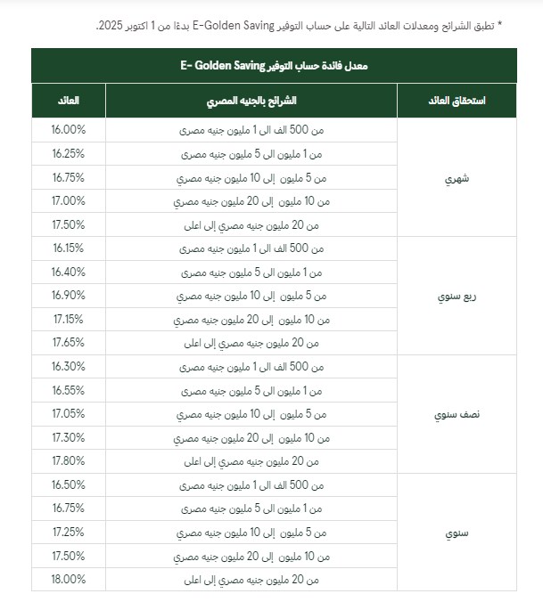 فيما تطبق الشرائح ومعدلات العائد التالية على حساب التوفير E-Golden Saving بدءًا من 1 أكتوبر 2025.
