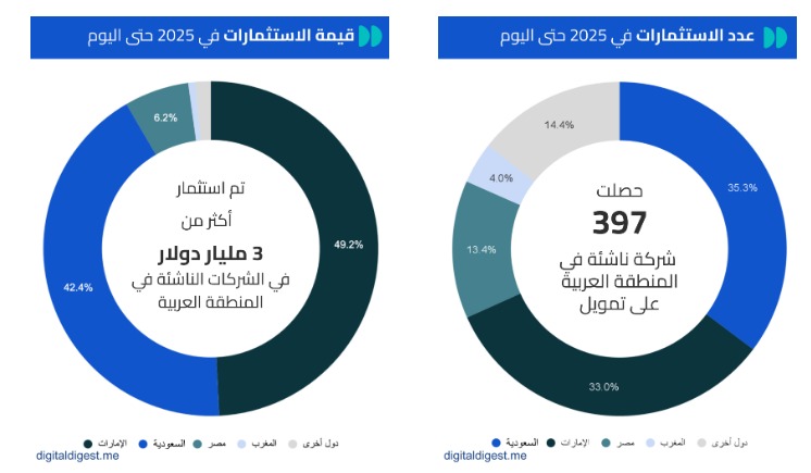 ارتفع إجمالي التمويلات المعلنة خلال الربع الثالث من 2025 إلى أكثر من 1.9 مليار دولار توزعت على 153 شركة ناشئة، وفق تقرير الموجز الرقمي. استحوذت الشركات الإماراتية على نحو 58% من قيمة التمويل و34% من عدد الصفقات، مدفوعة بصفقة «Property Finder». وبلغ إجمالي التمويلات منذ بداية العام أكثر من 3 مليارات دولار عبر 397 صفقة. وللمقارنة، سجلت تمويلات 2022 بالكامل 2.38 مليار دولار، مما يبرز القفزة في نشاط الاستثمار الجريء خلال 2025.